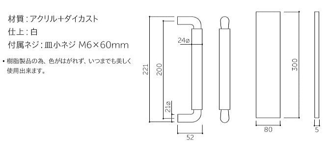 アクリル ネオトイレハンドル 押し板【取っ手】の詳細 材質:アクリル+ダイカスト 押し板サイズ:80mm×300mm 取っ手サイズ:φ24mm×全長221mm 仕上:白 押し板と取っ手で1組です。