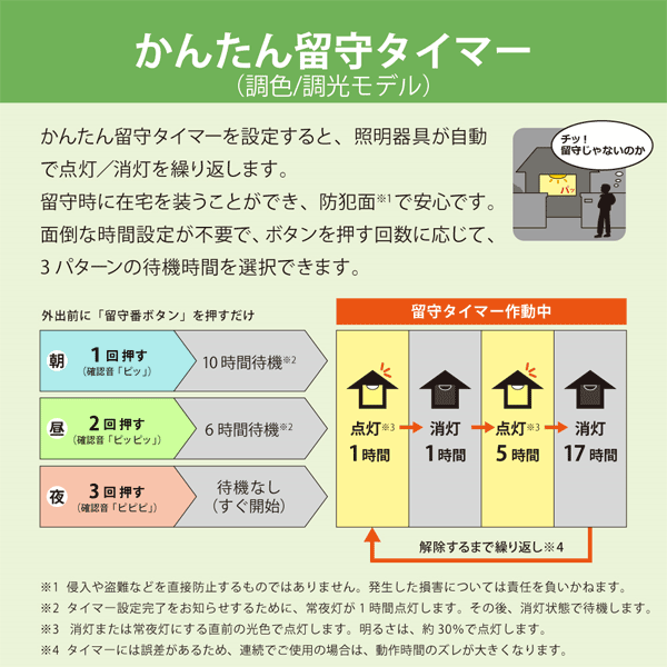●NEC LED洋風シーリングライト ●LIFELED'S 〜6畳 ●型番:HLDC06208 ●デジタル連調10 ●連続・多段調光 ●防虫ガイド ●かんたん留守タイマー ●天井直付 ●簡単取付I ●光源: LED(昼光色〜電球色) ●光源色・相関色温度:昼光色 6,500K Ra85 電球色 2,700K Ra85 ●モジュール寿命: 40,000時間(光束維持率:70%) ●消費効率 : 固有エネルギー消費効率:123.3lm/W(3699lm・30W) ●制御機能:リモコン:連続調光(100%〜約10%)、多段調光(100%〜約10%(10段階))、LED常夜灯(7段階調光)、滅/調色段階 5通り/壁スイッチコントロール ●タイマー : スリープタイマー(30分・60分)かんたん留守タイマー ●器具仕様 : 乳白色アクリル ●サイズ: 外径φ464mm 高135mm 質量1.5kg ●付属リモコン: RE0209 ※LEDの寿命は40,000時間(光束維持率70%)ですが、製品の寿命を保 証するものではありません。